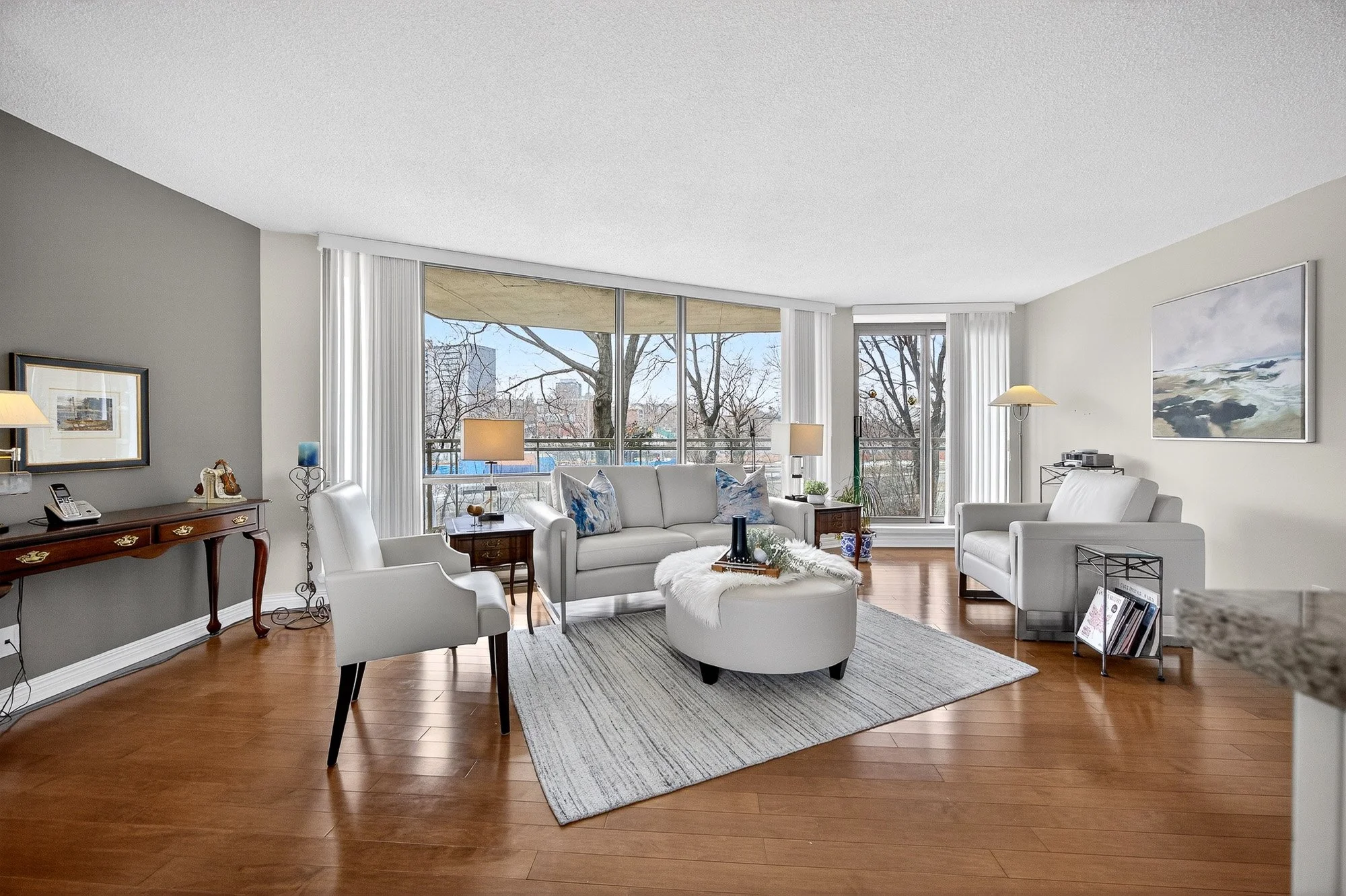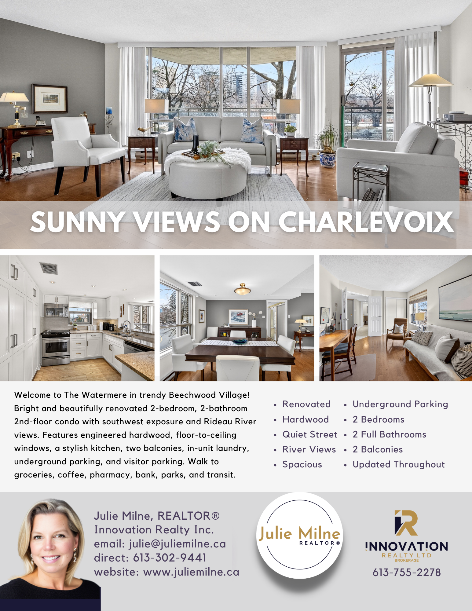 Welcome to The Watermere - a beautifully renovated second-floor condo offering bright, modern living with beautiful views of the Rideau River. Located in the heart of trendy Beechwood Village, this spacious two-bedroom, two-bathroom unit is filled with natural light thanks to floor-to-ceiling windows with desirable south-west exposure that flood the living space with sunshine throughout the day.The open layout features engineered hardwood flooring and a gorgeous renovated kitchen with neutral finishes that create a warm and inviting atmosphere. The primary bedroom offers a peaceful retreat with its own private balcony overlooking the river, along with a full ensuite bathroom and generous closet space. A second bedroom and full bathroom provide excellent flexibility for guests, a home office, or additional living space.
